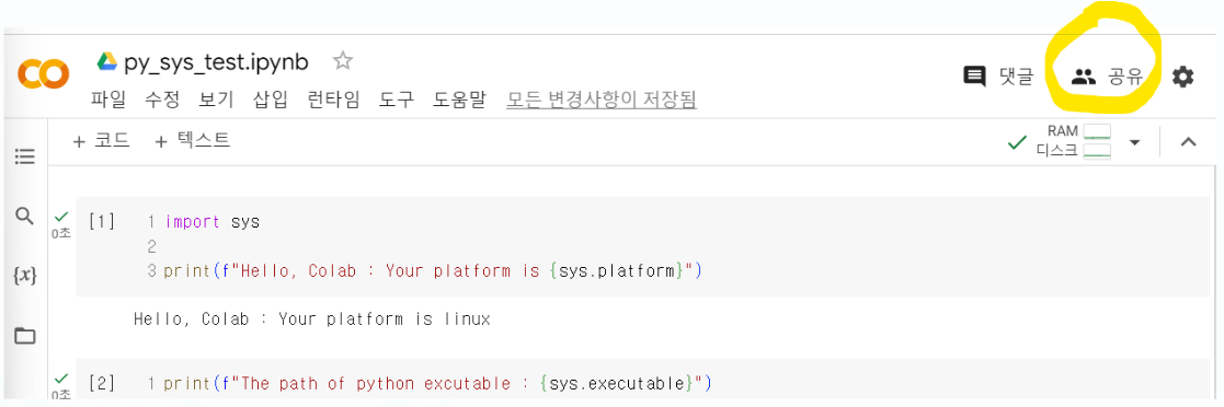 colab의 오른쪽 상단에 있는 공유를 클릭한다.