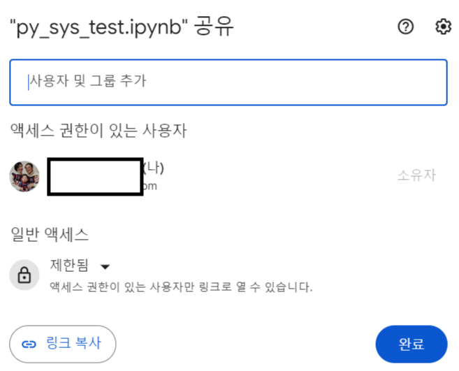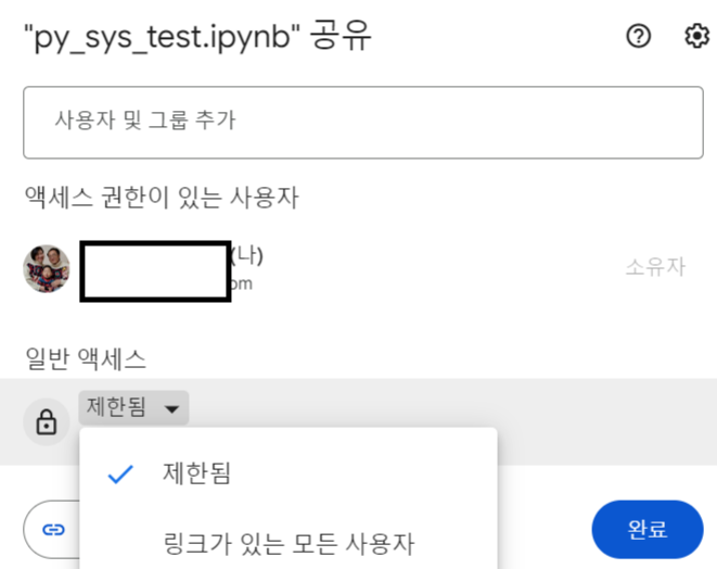 아래에 있는 일반 액세스 부분을 클릭하여 "제한됨"에서 "링크가 있는 모든 사용자" 로 바꿀 경우엔 해당 ipynb에 대한 URL로 들어오는 모든 이들에게 접근이 허용된다.