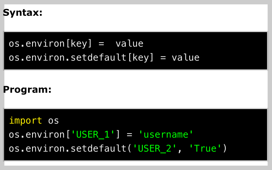 dict 에 새로운 key-value 의 item을 추가하거나 기존의 key의 값을 바꾸는 방식 그대로 환경변수를 덮어쓰거나 설정할 수 있음.