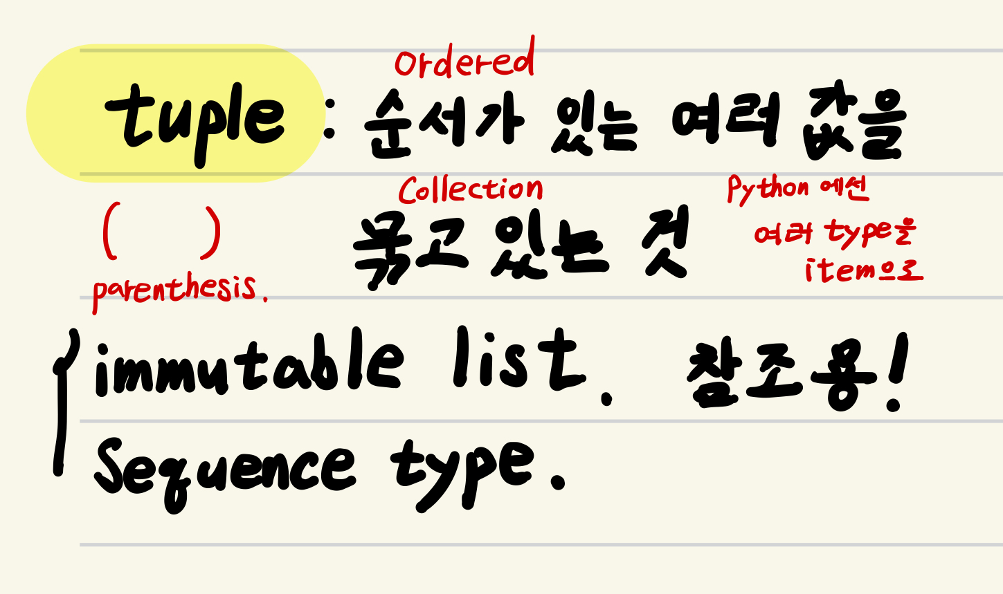 - 읽기 전용의 sequence가 필요한 경우 많이 사용됨: 참조용으로만 사용되는 데이터에 사용됨.