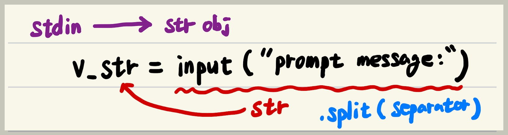 input()함수가 반환하는 것이 string(문자열)이므로 str의 method인 split 등을 통해 공백문자나 separator (or delimiter) 문자를 통해