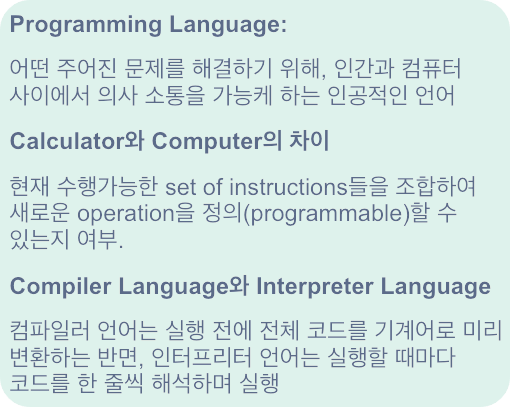 abstraction control structure high-level language low-level language programming Programming Language 어떤 주어진 문제를 해결하기 위해, 인간과 컴퓨터 사이에서 의사 소통을 가능케 하는 인공적인 언어 Natural Language(