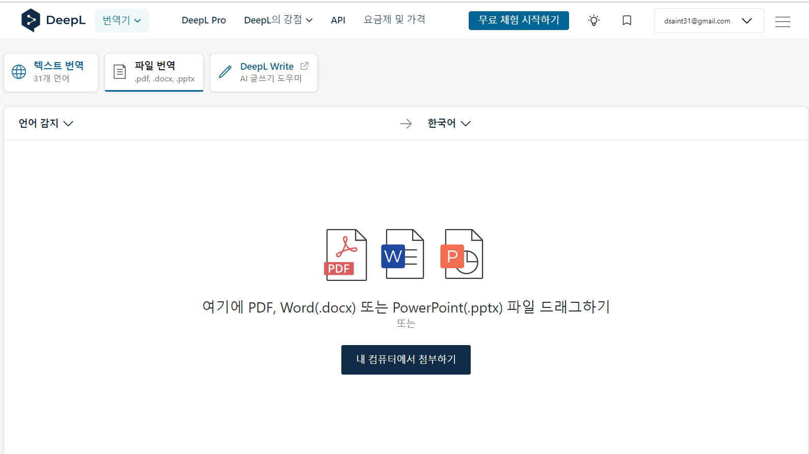 pdf, docx, pptx 등의 파일을 업로드시키고 번역하는 기능 (계정 필요하나 무료 계정으로 수행가능함).