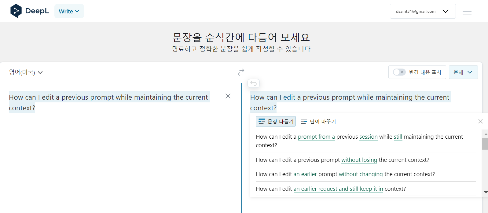 - 위의 그림에서 왼쪽에 기재된 문장에 대해 오른쪽에 DeepL이 제안하는 문장이 나오고,