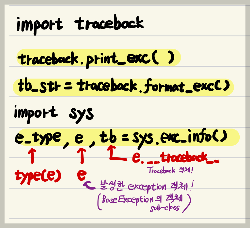 print_exc(): 현재 스레드에서 마지막으로 발생한 예외의 traceback 메시지를 출력한다 (exc = exception).format_exc(): 현재 스레드에서 마지막으로 발생한 예외의 traceback 메시지 에 해당하는 문자열을 반환한다.print_tb(traceback_obj): 지정된 트레이스백 객체의 정보를 표준 출력(콘솔)으로 직접 출력한다.format_tb(traceback_obj): 지정된 트레이스백 객체의 정보를 문자열(리스트 형태)로 반환. (화면에 출력하지 않음)