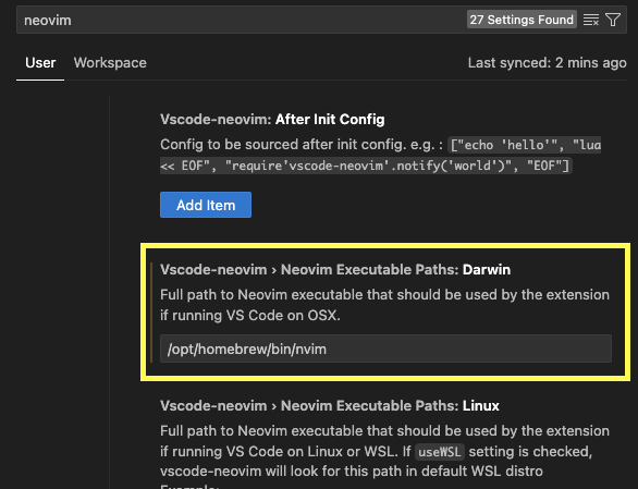 cmd + , 를 통해 Settings를 열고, neovim으로 검색한 후