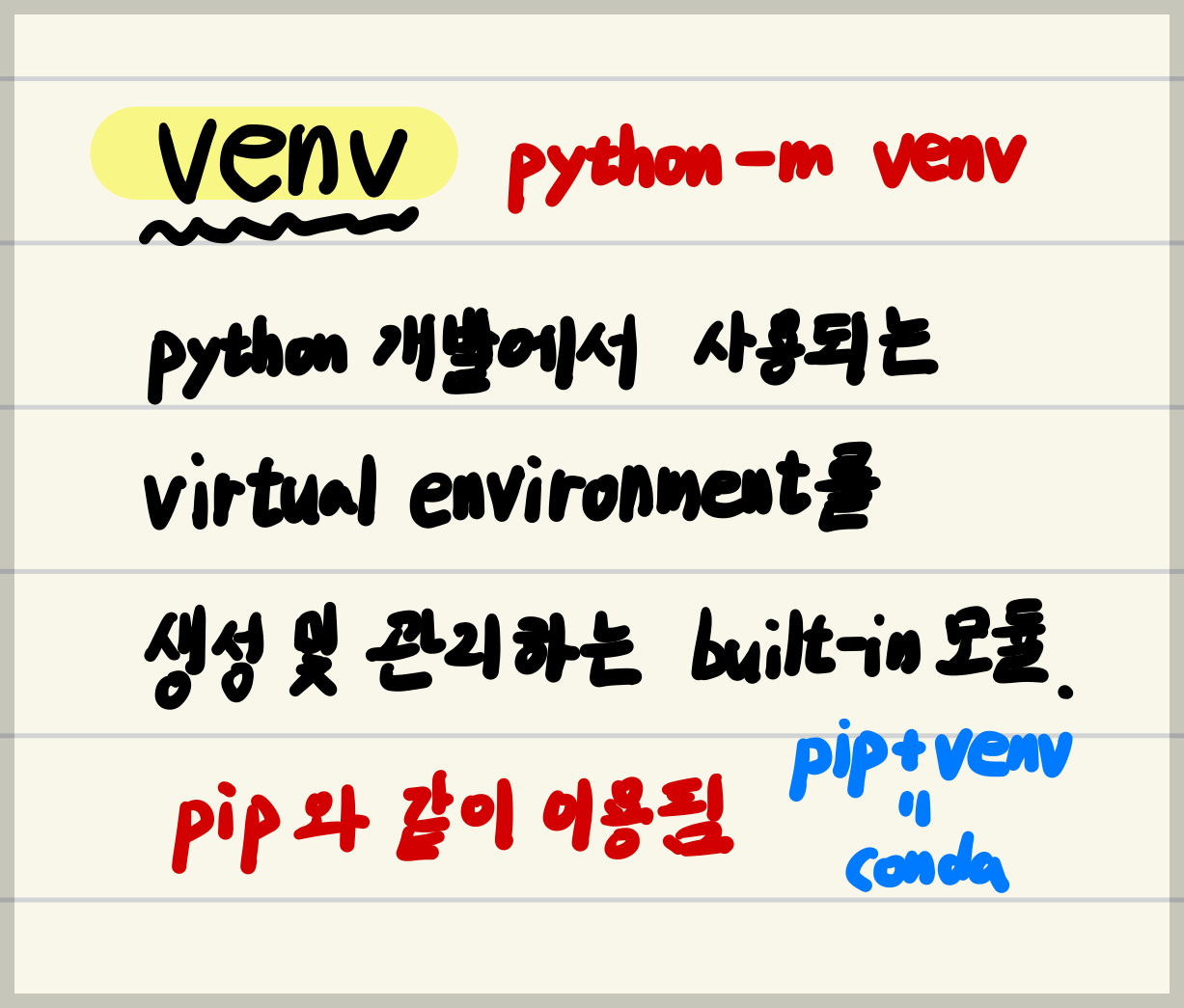 환경이름/lib/python3.x/site-packages라는 subdirectory에 설치되는 패키지들이 위치하게 됨.- host system과 다른 virtual environment에 영향을 주지 않음.