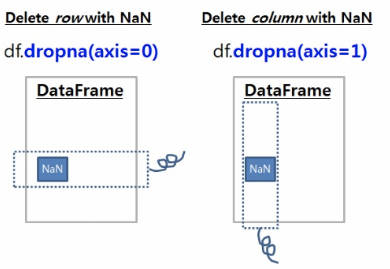 axis라는 parameter 의 값이 0 이면 row 를 1 이면 column 을 제거.how라는 parameter 의 값이'any'로 주어지면 하나라도na가 존재하면 행 또는 열에 drop(제거)이 이루어지며,'all'인 경우엔 해당 행 또는 열이 모두na로 구성될 경우에 삭제됨.