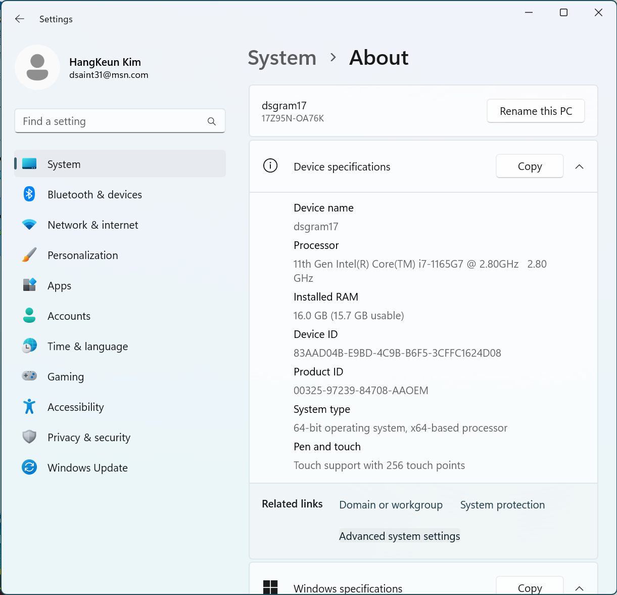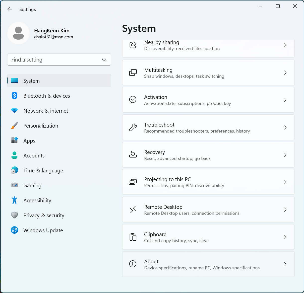 왼쪽 사이드 바에서 System이 선택된 상태에서 아래로 내리면 About이 나옴. 이를 클릭.