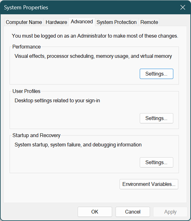 System > About 패널에서 중간에 있는 Related links 에서 Advanced system settings를 클릭.