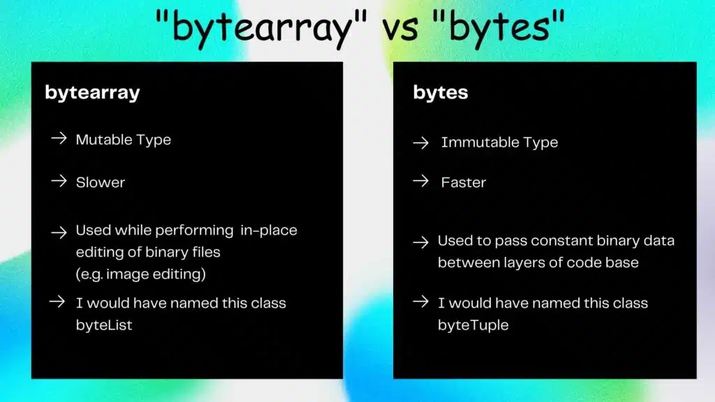 bytesarray는 변경가능함.arr = bytearray(b'Hello')를 수행하고arr[0] = b'J'와 같은 코드를 수행하면arr은b'Jello'로 변경됨.