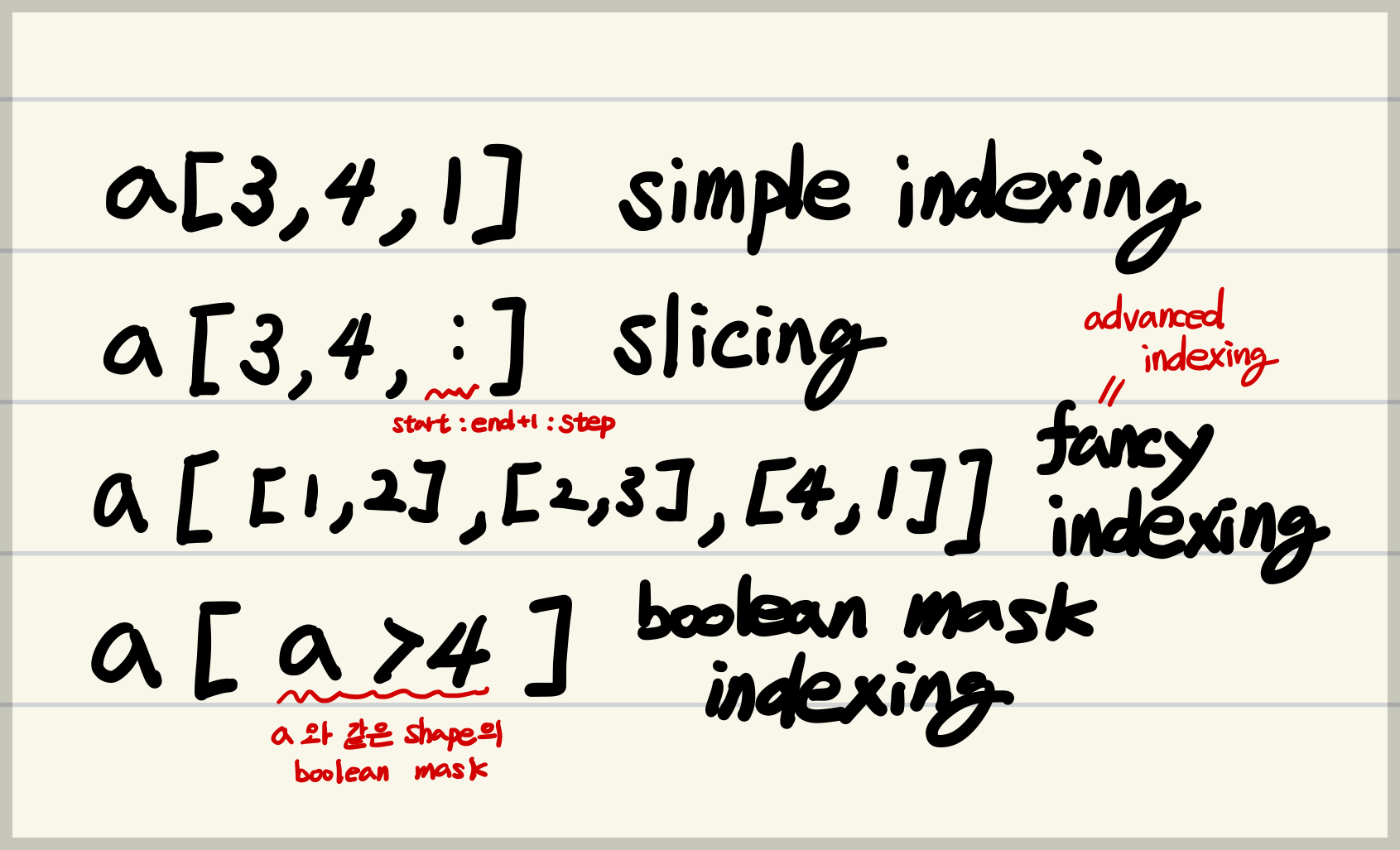 IndexingNumPy에서 indexing은 4+1 가지 방식을 따름.scalar를 이용한 indexing ( simple indexing ) : array[0]slicingboolean mask : array[array > 1]fancy indexing : vectorized indexing. index들을 element로 가지는 array를 넘겨줌.combined