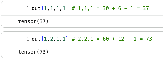 - index tensor가 2개이므로 원본의 첫 2개 차원을 결정.