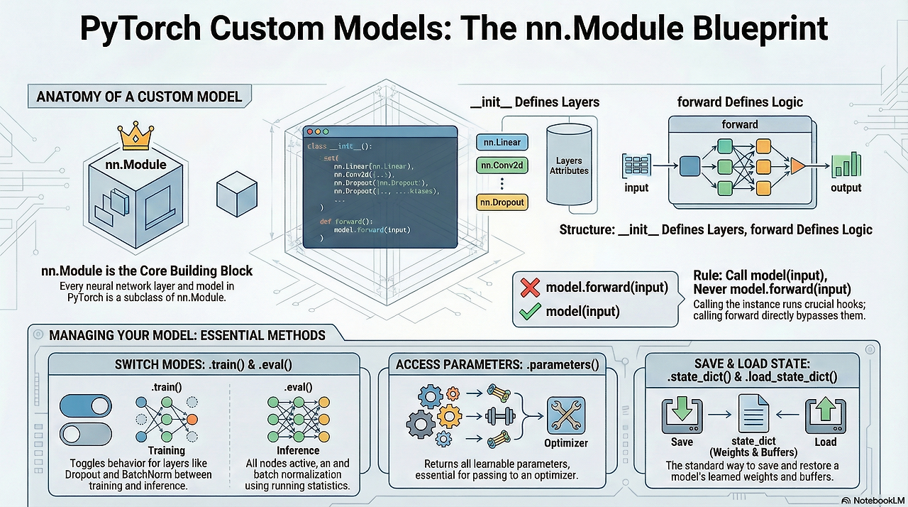 nn.Linear,nn.Conv2d, etc.)까지 전부nn.Module을 상속받아 만들어짐. - Model (or Submodule)을 구조화하고 학습 가능한 parameters를 관리하는 데 핵심적인 역할을 함.