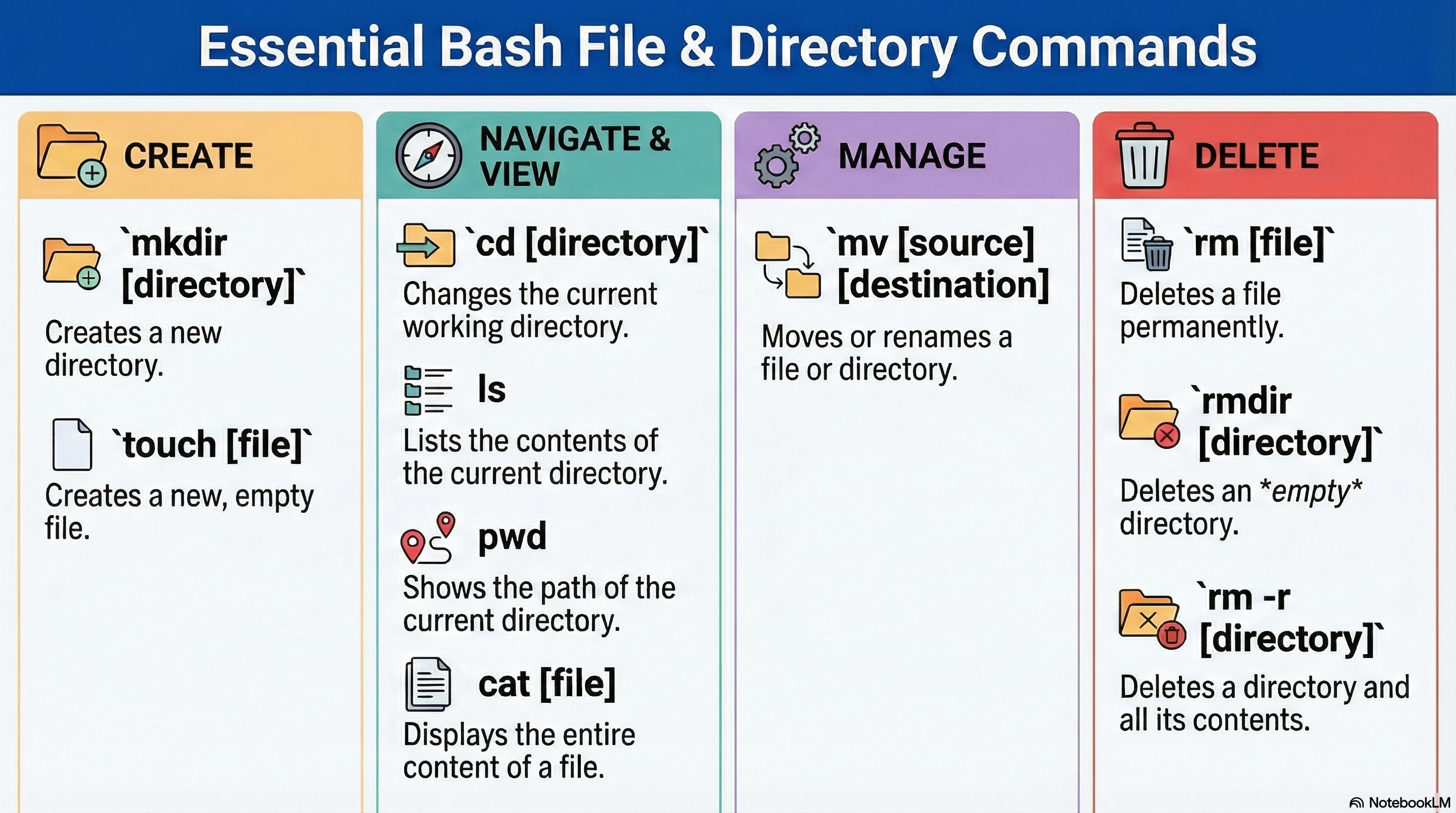 mkdir [디렉토리명]: 디렉토리 생성cd [디렉토리명]: 디렉토리 이동touch [파일명]: 빈 파일 생성echo "내용" > [파일명]: 파일 생성 및 내용 추가ls: 현재 디렉토리 내용 확인mv [파일명/디렉토리명] [새_이름/목적지]: 파일 및 디렉토리 이동 또는 이름 변경diff [파일1] [파일2]: 두 파일의 차이점을 비교cmp [파일1] [파일2]: 두 파일이 동일한지 확인rm [파일명]: 파일 삭제rmdir [디렉토리명]: 비어있는 디렉토리 삭제rm -r [디렉토리명]: 비어있지 않은 디렉토리 강제 삭제pwd: 현재 경로 확인ls -la: 숨겨진 파일 포함, 자세히 목록 보기cat [파일명]: 파일 내용 보기du -sh: 디스크 사용량 보기