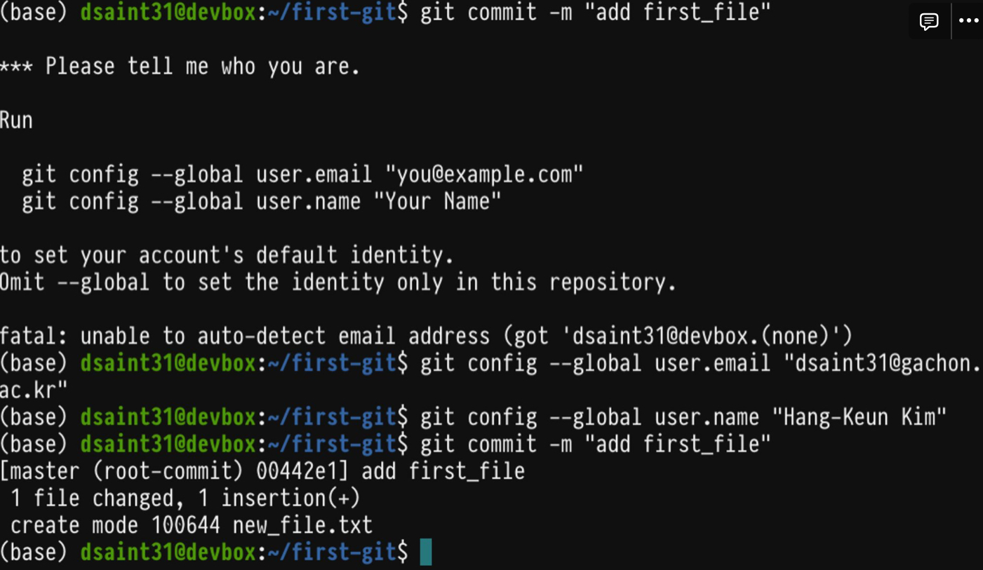- 여기서는 최초로 git commit을 수행한 경우로, "유저가 누구인지를 입력하라는 메시지"를 볼 수 있음.