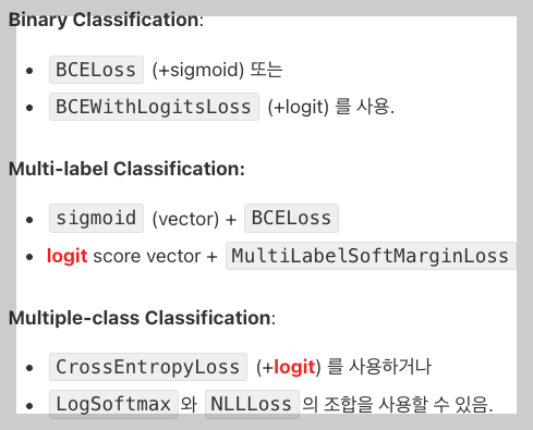 CrossEntropyLoss(+logit) 를 사용하거나LogSoftmax와NLLLoss의 조합을 사용할 수 있음.