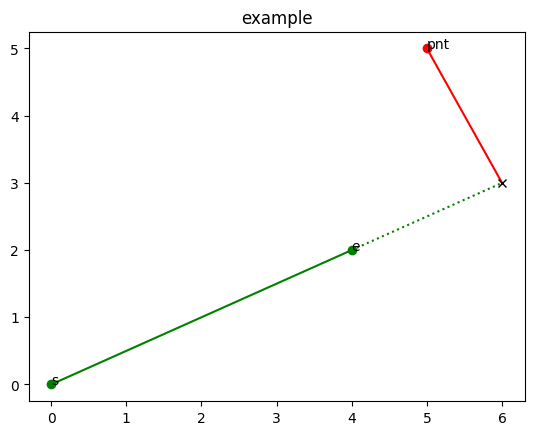다음은 foot of perpendicular line (intersection)과 line-segment 중에서 pnt와 가장 가까운 점 (closet_pnt)을 반환하는 function을 구현한 예제임.