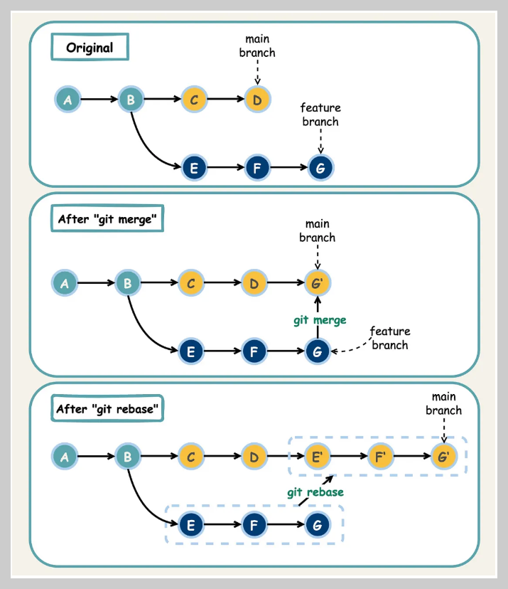 이들 각각의 동작방식은 다음을 참고: 2024.05.26 - [utils/git and github] - [Git] merge mode: merge and rebase.