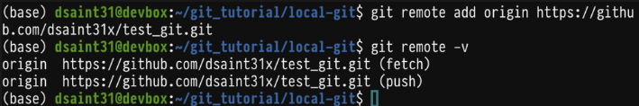 git remote add <단축이름> <remote_repository_url>형태임. git remote -v로 연결이 제대로 되었는지 확인.