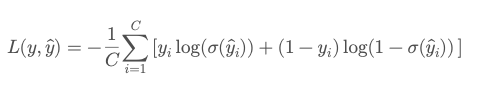 $$L(y, \hat{y}) = -\frac{1}{C} \sum_{i=1}^C [y_i \cdot \log(\sigma(\hat{y}_i)) + (1 - y_i) \cdot \log(1 - \sigma(\hat{y}_i))]$$