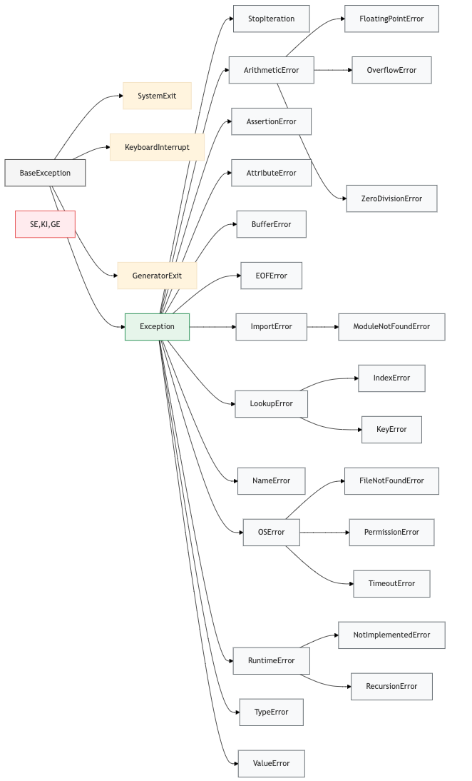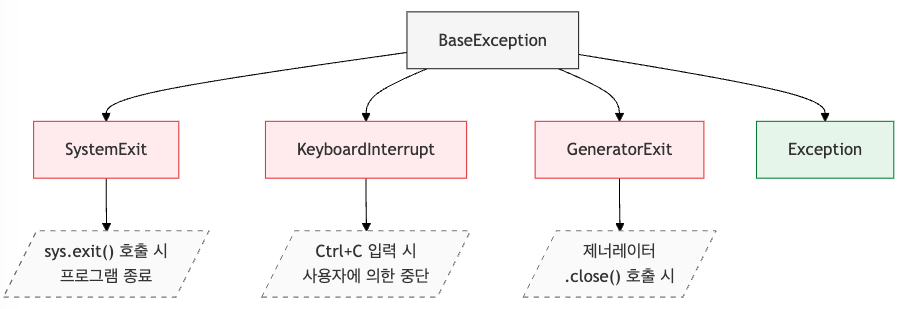 SystemExit,KeyboardInterrupt,GeneratorExit와 같은 예외들은Exception이 아닌BaseException을 직접 상속.- 이런 예외들은 일반적으로 프로그래머가 처리하지 않고, 프로그램의 종료와 같은 중요한 상황에서 발생하는 예외.