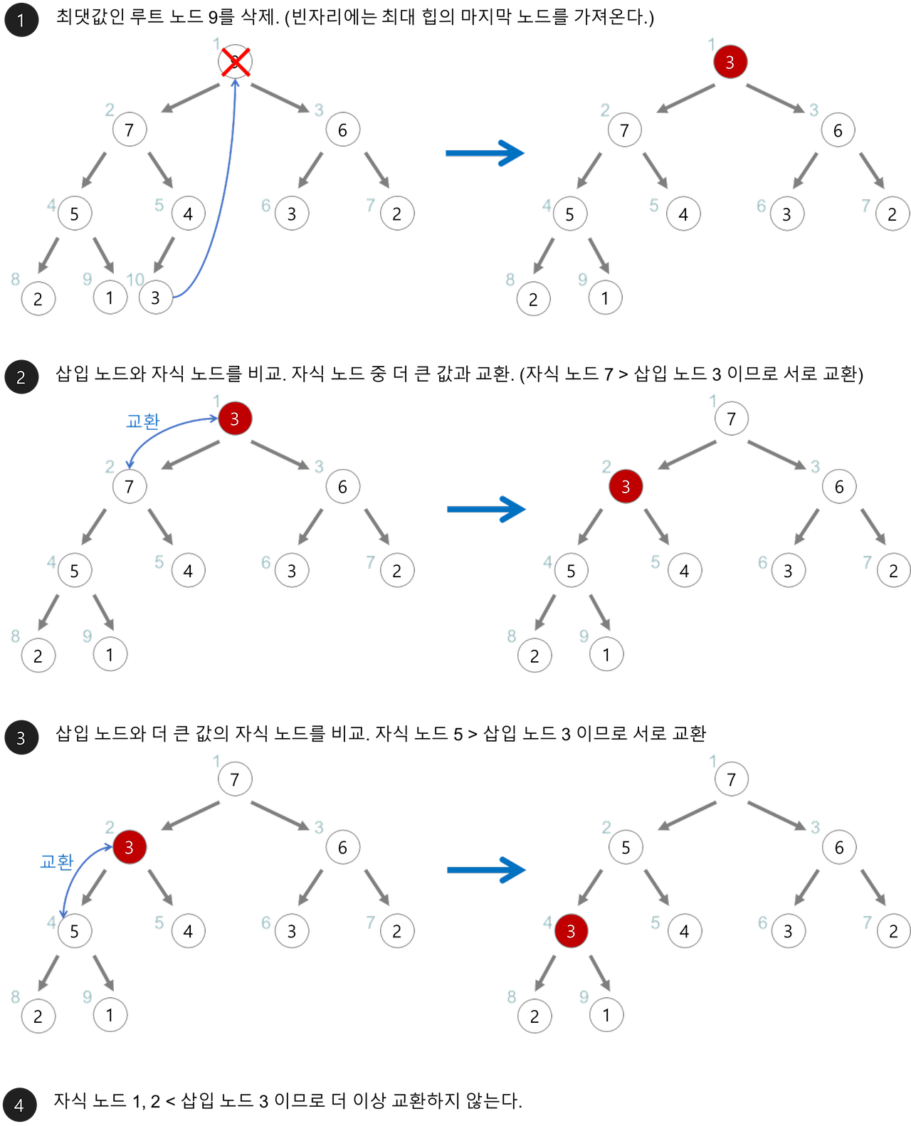 - 루트 노드 제거: 루트 노드를 제거한 후, 트리의 마지막 노드를 루트 위치로 이동합니다.
