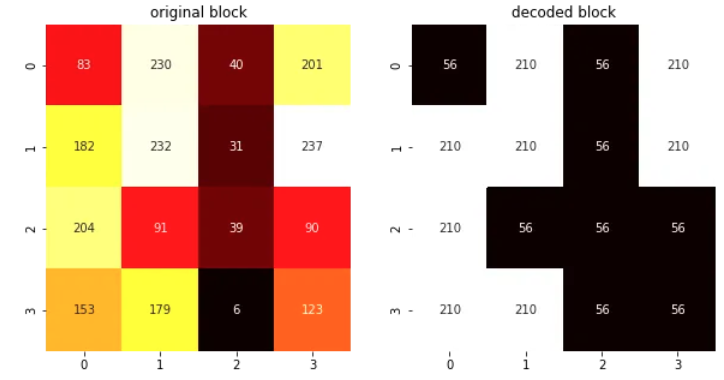 인코딩된 이미지의 각 4×4 블록에 대해 다시 이미지로 복원하기 위해서는 압축을 해제해야 함: 디코딩