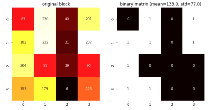 다음으로, binary 4×4 matrix (또는 binary block)를 계산함.