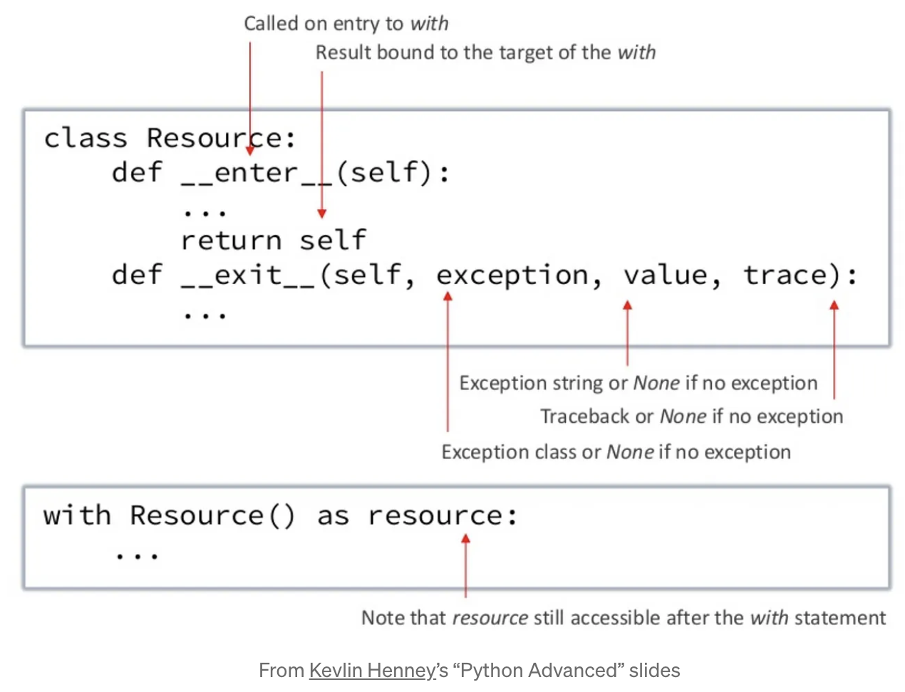 __exit__:with문을 벗어날 때 호출되는 method.- resource를 해제하여 OS에 돌려주는 작업을 수행.