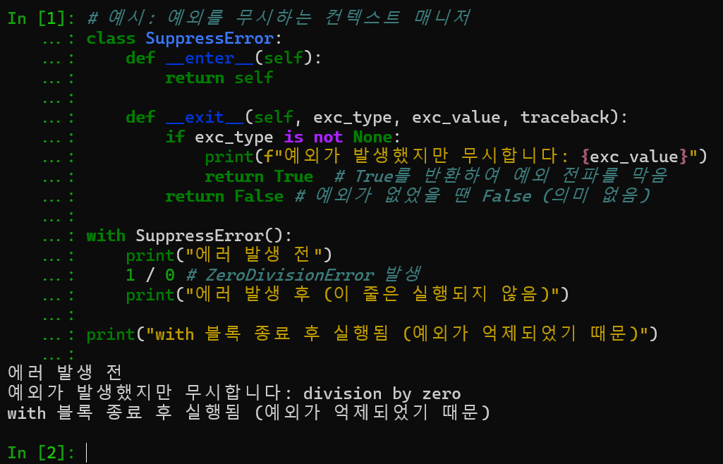 True: "__exit__로 인자로 넘겨진 예외" 를 __exit__에서 처리하고 "with 블록 이후의 코드" 를 계속 실행False: "__exit__로 인자로 넘겨진 예외" 를 상위 호출자로 전파시킴.- 예외가 넘겨지지 않고 정상적으로 나간 경우 False를 반환해주는게 일반적임.