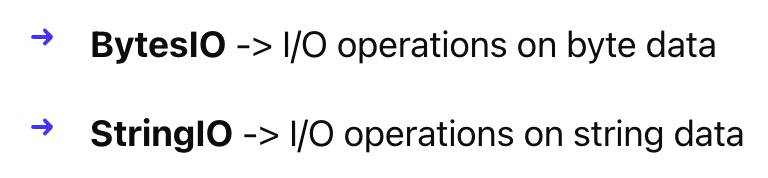 io모듈에서 제공하는 메모리 기반 파일 객체(memory-based file object)임. - 이들은 데이터를 메모리에 저장하면서 파일처럼 다룰 수 있는 기능을 제공함: Stream Object