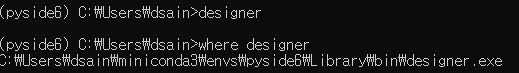 일반적으로 desinger (or designer.exe)가 pyside6만 설치시 존재하지 않음:qt-main을 설치하면, C:\Users\<사용자계정명>\miniconda3\envs\<가상환경이름>\Library\bin 밑에 designer.exe가 생김.