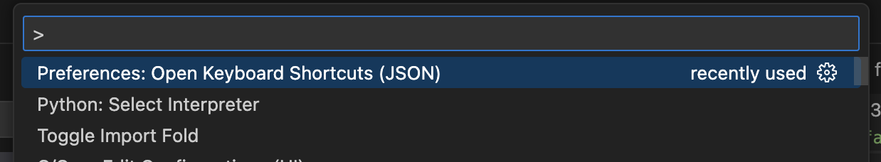 command palette에서 Perferences: Open Keyboard Shortcuts (JSON) 을 입력하여 Editor로 설정 관련 JSON 파일 keybindings.json을 연다.