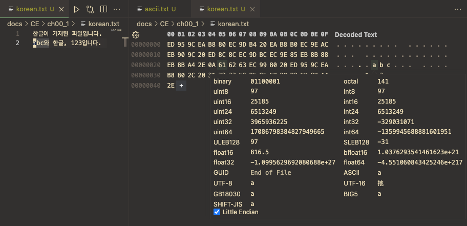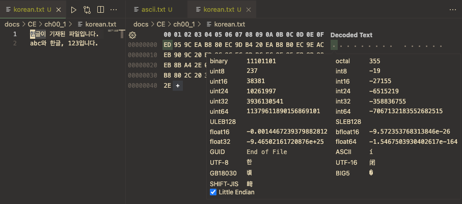 이를 살펴보기 위해 VSCode에 HEX Editor Extension을 설치하여 살펴봄.