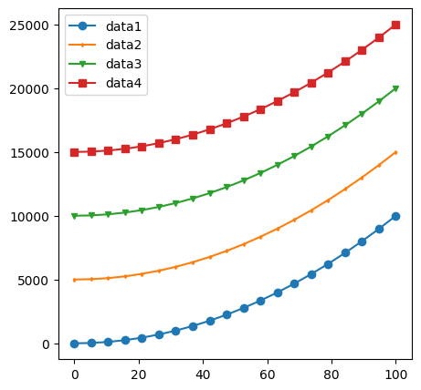 ax.plot(X,Y4,marker='s',markersize=6, label='data4') # default value