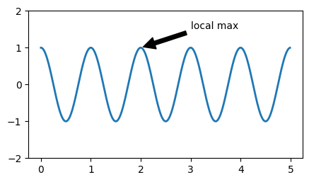 ax.annotate('local max', xy=(2, 1), xytext=(3, 1.5),
