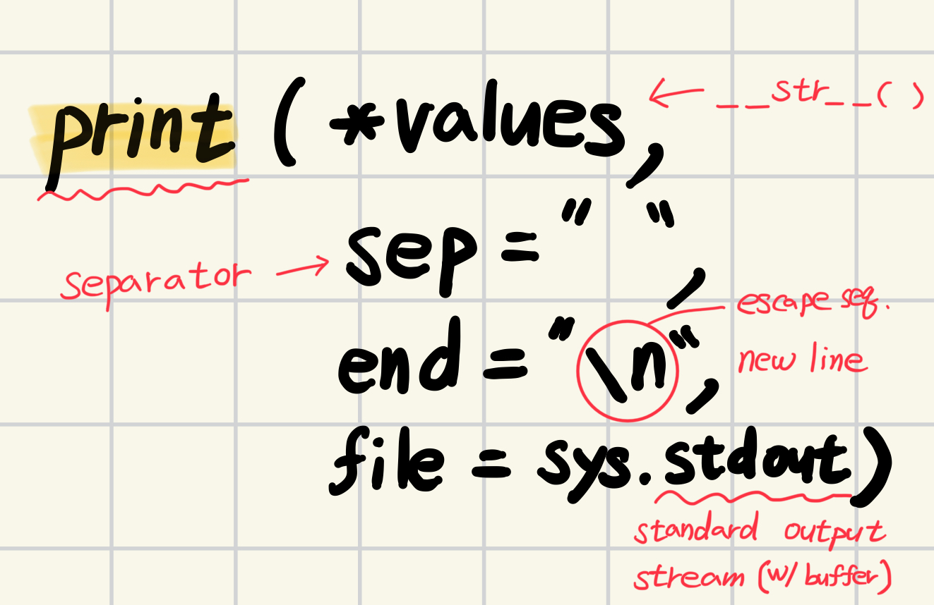print(value, ..., sep=' ', end='\n', file=sys.stdout, flush=False)