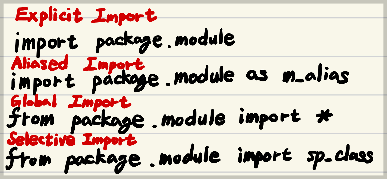 - 하지만, 긴 모듈의 전체 경로를 기재하기가 힘들어서 aliased import (아래 3번 참고)가 보다 많이 애용됨.
