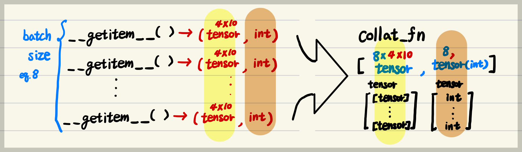 - 각 위치의 요소들끼리 batch 크기로 묶임: top-level data타입에 따라 tensor 혹은 tuple 객체가 됨.