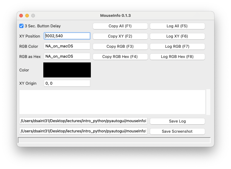 pyautogui.mouseInfo()를 사용할 경우, 현재 마우스 커서의 좌표(x, y)와 해당 위치 픽셀의 색상(RGB)을 실시간으로 확인할 수 있는 작은 창을 확인할 수 있음.이는 PyAutoGUI에 포함된 유틸리티 중 하나임.