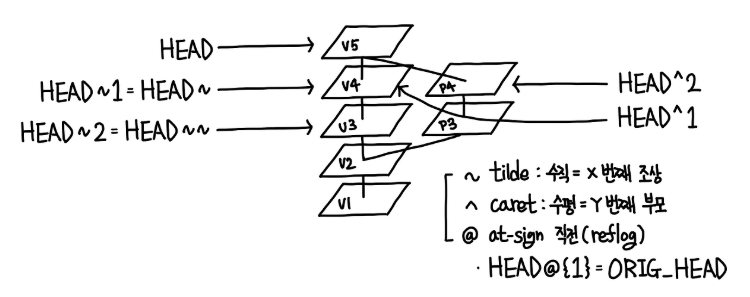 HEAD^또는HEAD^1은HEAD~1과 같이 첫번째 부모를 가리킴.- 일반적으로 merge가 일어난 commit 등을 제외하면 parent commit은 1개인 점을 주의할 것.