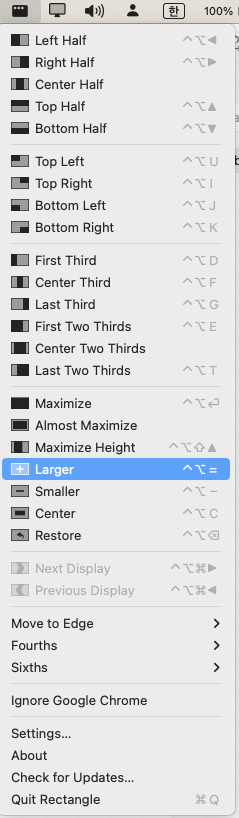 menubar의 icon을 클릭하면 다음과 같이 window들을 배열할 수 있음. 여기서 settings를 누르면 단축키 등도 확인 가능함.