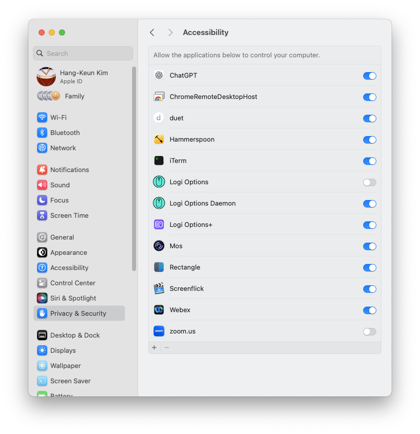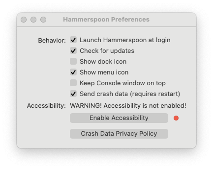 macOS에서 System Settings > Privacy & Security > Accessibility (접근성) 에서 Hammerspoon 의 권한을 활성화.