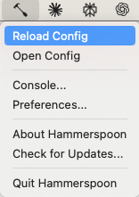 이제 Hammerspoon의 실행을 macOS의 상단메뉴바에서 망치 아이콘으로 확인 가능함