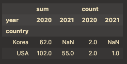 dropna:True면 모든 값이NaN인 열 레벨 제거observed: 범주형 변수 사용 시 관측된 조합만 표시할지 여부False가 기본값으로 관측되지 않은 조합도 표시됨.