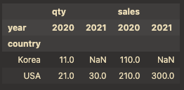 mean,sum,first등 NaN처리 필요 여부:fill_value사용- 전체 합계 필요 여부: