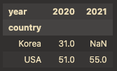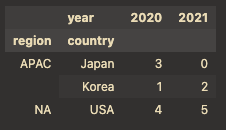 pt = df.pivot_table(index="country", columns="year", values="value", aggfunc="sum", fill_value=0)