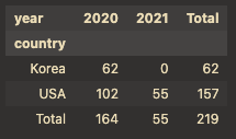 "country": ["Korea", "Korea", "USA", "USA", "USA"],