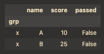 h.loc[("x", "A")] # (grp='x', name='A') row 선택 (라벨 튜플)